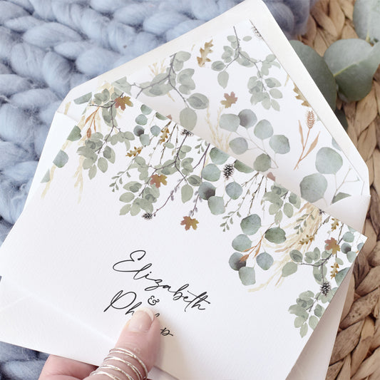 Modern collection of rustic wedding stationery, featuring a watercolour illustration of green foliage with autumn leaves. Perfect to set the scene for both classic autumn weddings.