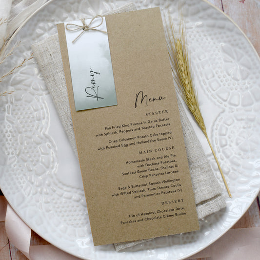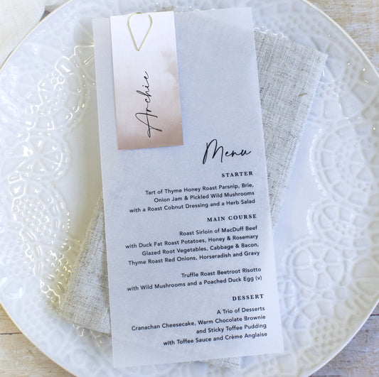 Mocha Vellum Wedding Menu with Guest Name Tag