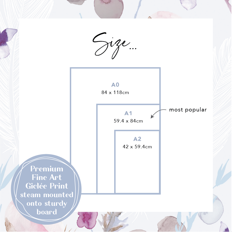A beautiful premium quality wedding Table Plan board featuring a pale blue wash background with bright wildflowers and set with modern caligraphy type. Fully personalised with your names, date of wedding, table names and guest names. Our table plans are printed as FIne Art Giclee prints and steam mounted onto sturdy mount board; a luxurious high quality finish.