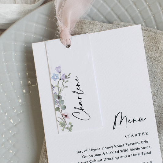 A card wedding menu plus a guest name card attached with a tear drop clip or raw edge ribbon