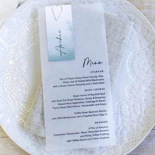 Ocean Blue Vellum Wedding Menu with Guest Name Tag