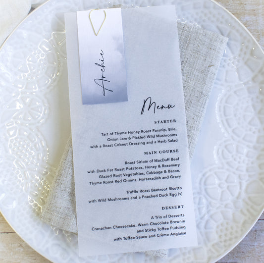 Winter Blue Vellum Wedding Menu with Guest Name Tag