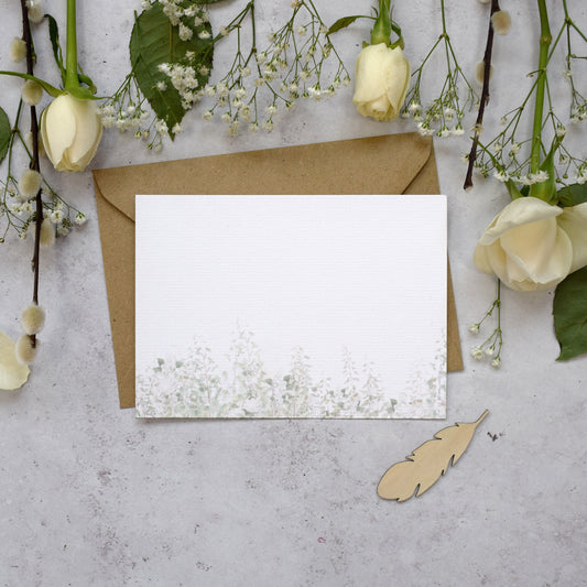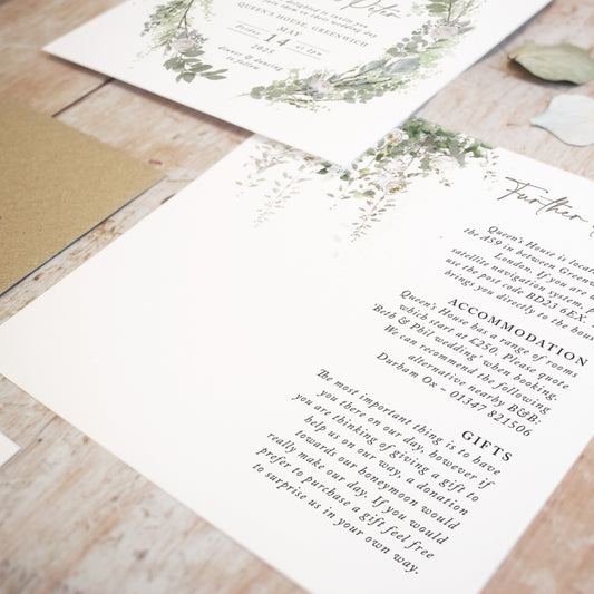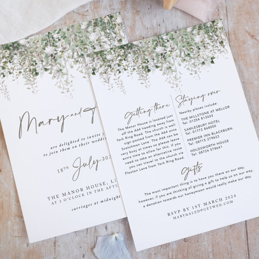 Pretty collection of illustrated wedding stationery, featuring a watercolour illustration of green foliage and white roses. Perfect to set the scene for a classic and elegant wedding.