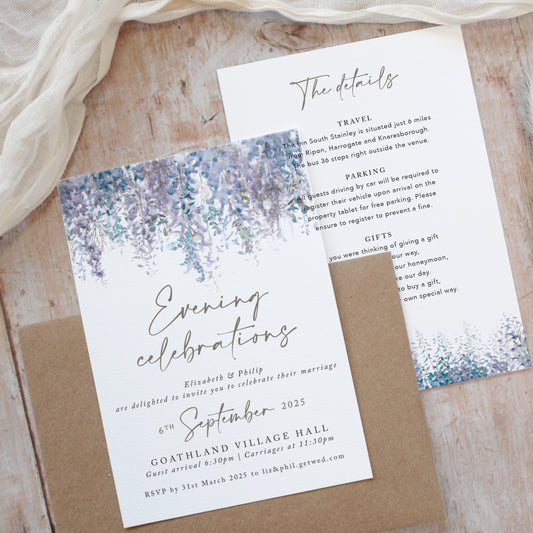 Pretty collection of illustrated wedding stationery, featuring a watercolour illustration of delicate foliage interwoven with winter pansies and snowdrops, perfect for setting the scene for a whimsical winter wedding.