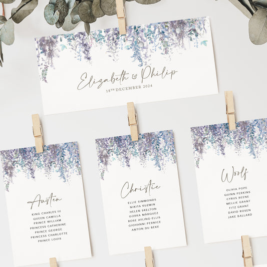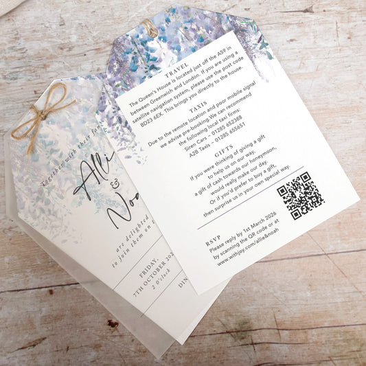 Lavender Blue Vellum Wedding Menu with Guest Name Tag