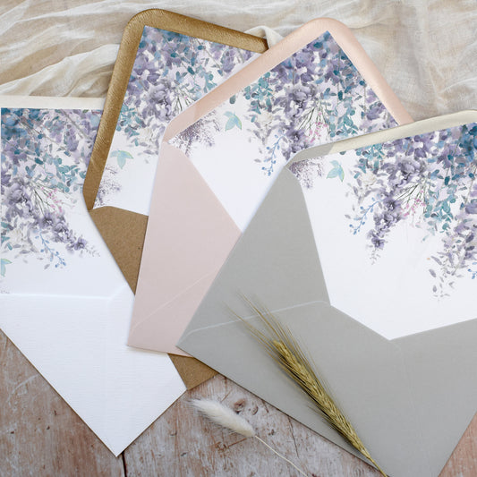 Pretty collection of illustrated wedding stationery, featuring a watercolour illustration of delicate foliage interwoven with winter pansies and snowdrops, perfect for setting the scene for a whimsical winter wedding.