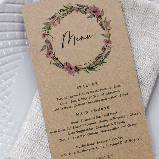 Whisper Wreath Kraft Wedding Menu Cards