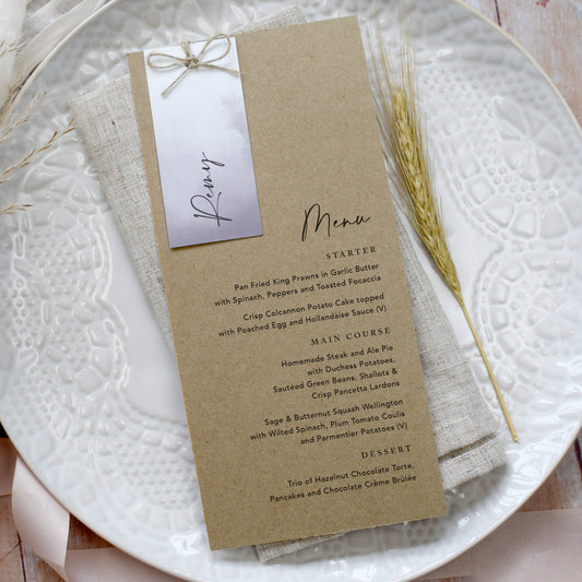Dusky Pink Vellum Wedding Menu with Guest Name Tag