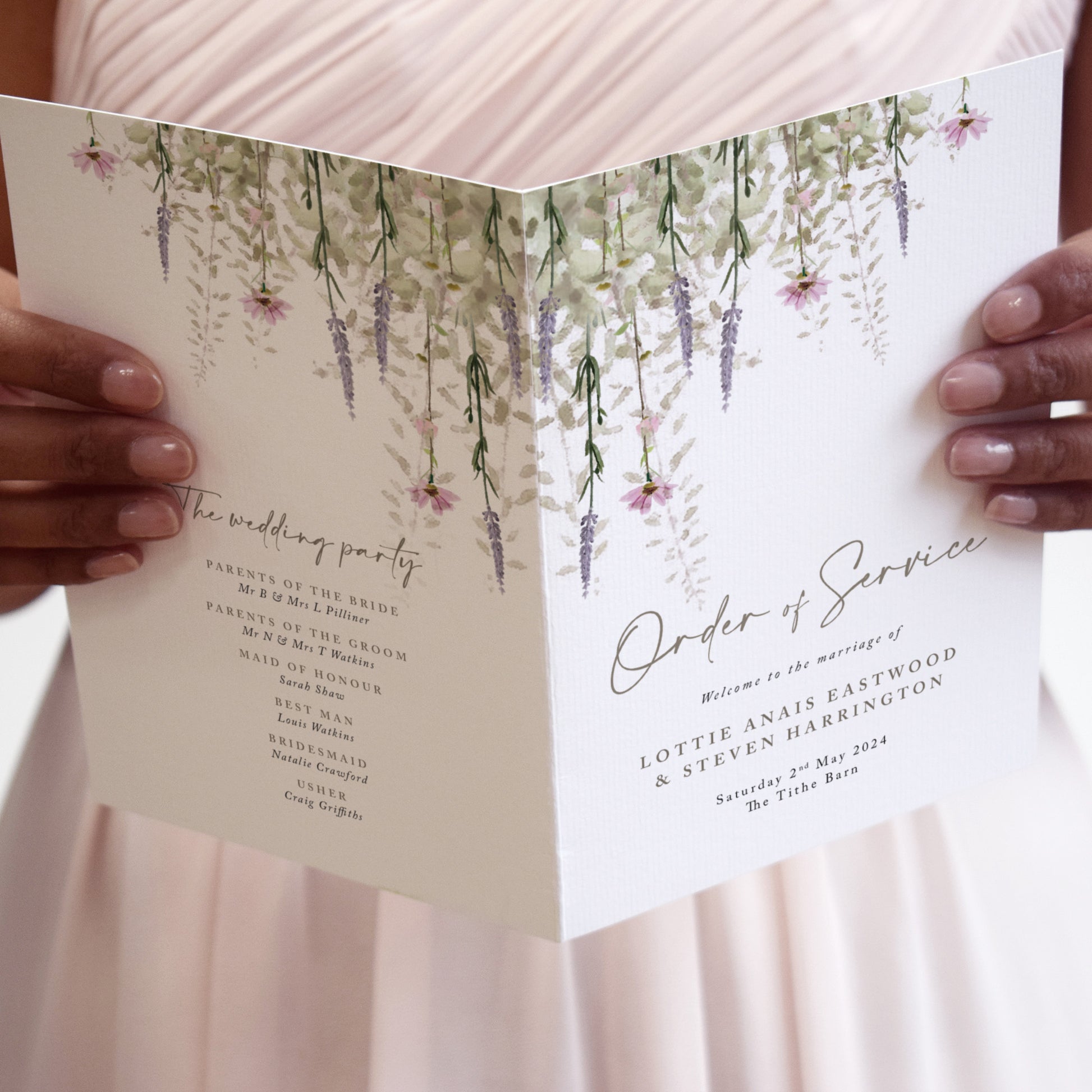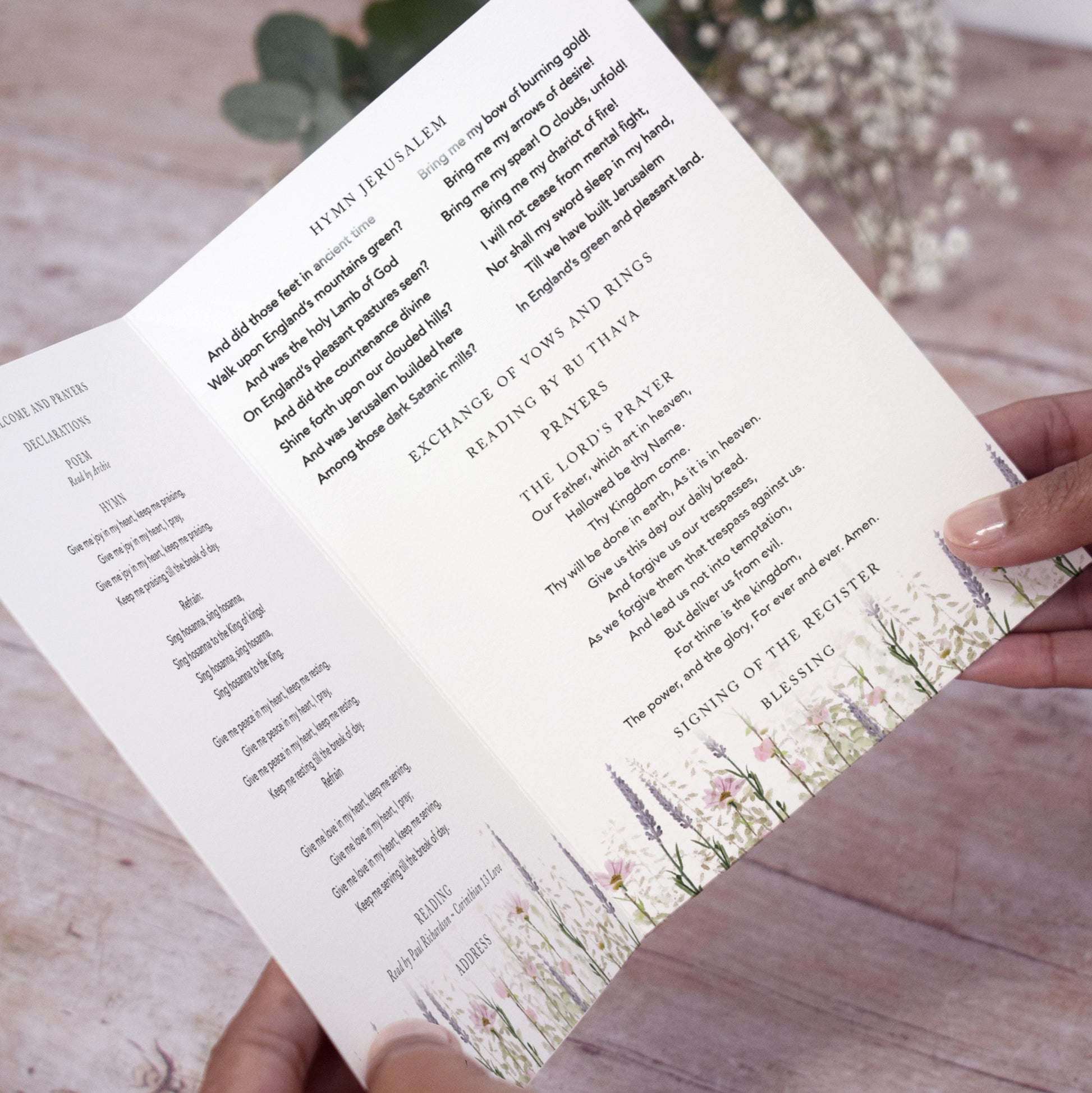To be given to guests as they arrive at your wedding, guide your family and friends through your wedding service with details about the ceremony running order and wording to hymns.