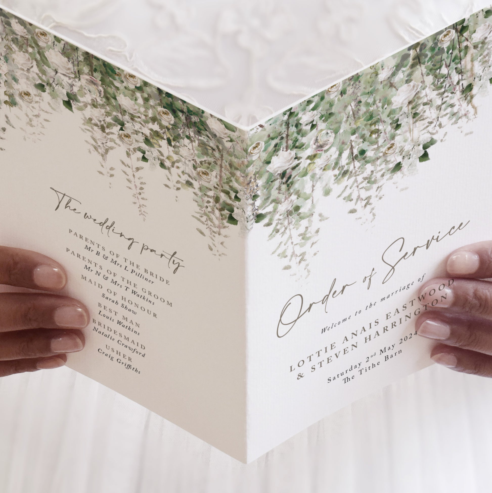To be given to guests as they arrive at your wedding, guide your family and friends through your wedding service with details about the ceremony running order and wording to hymns.