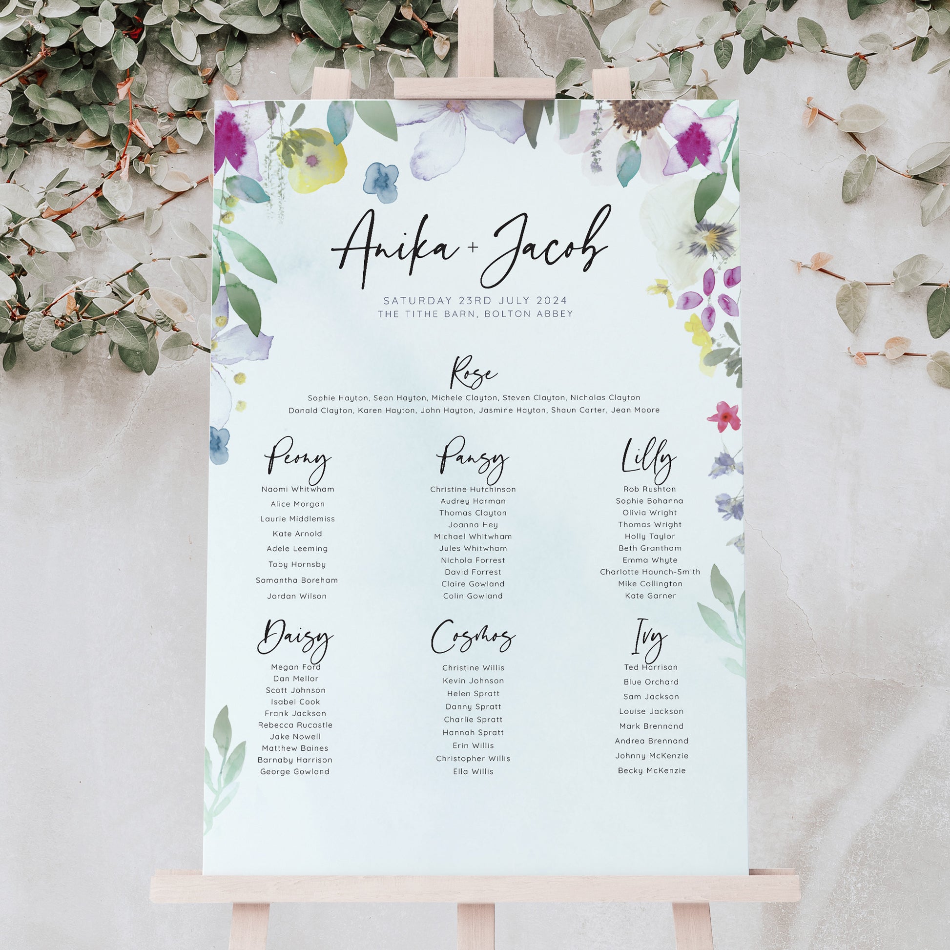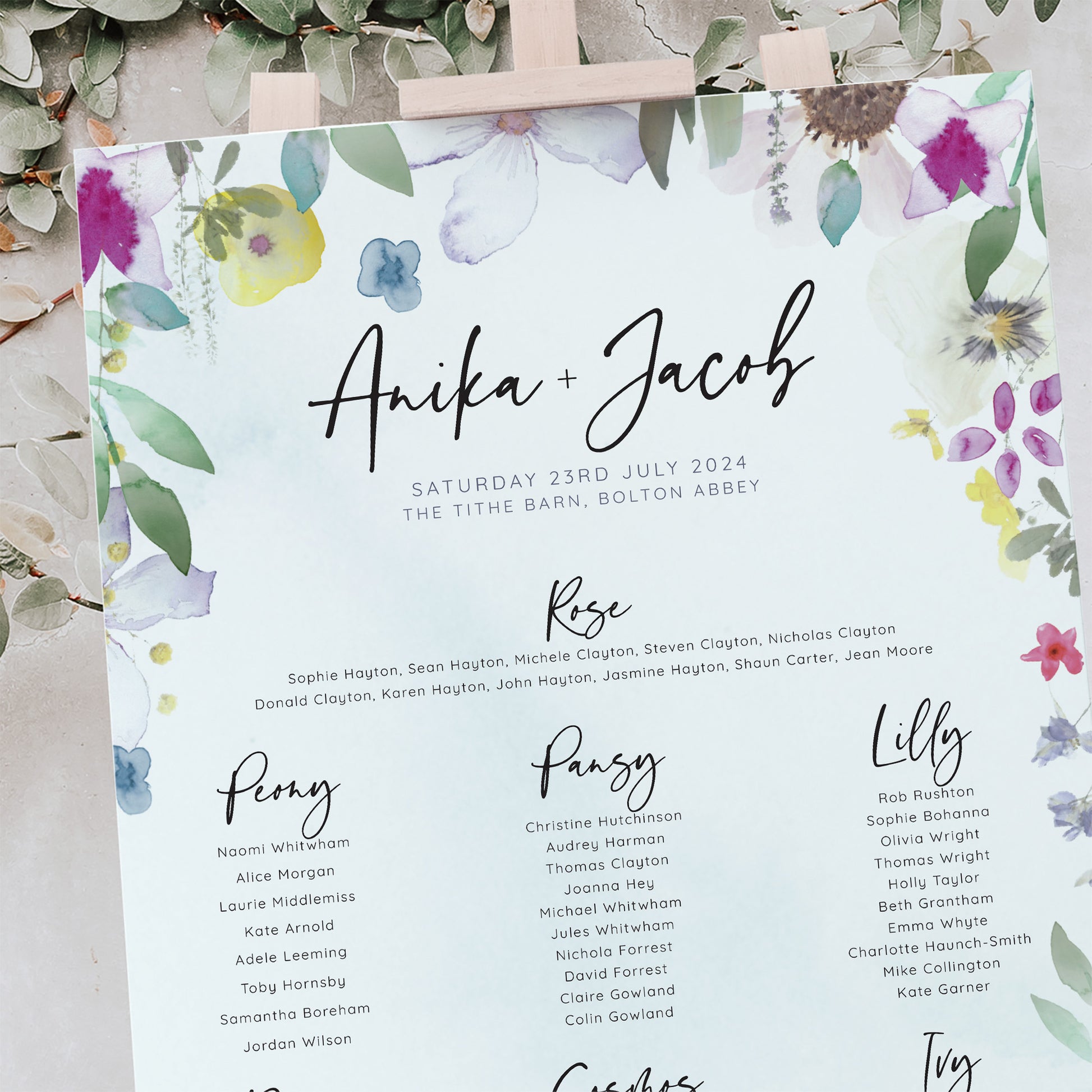 A beautiful premium quality wedding Table Plan board featuring green foliage with bright wildflowers and set with modern caligraphy type. Fully personalised with your names, date of wedding, table names and guest names. Our table plans are printed as FIne Art Giclee prints and steam mounted onto sturdy mount board; a luxurious high quality finish.