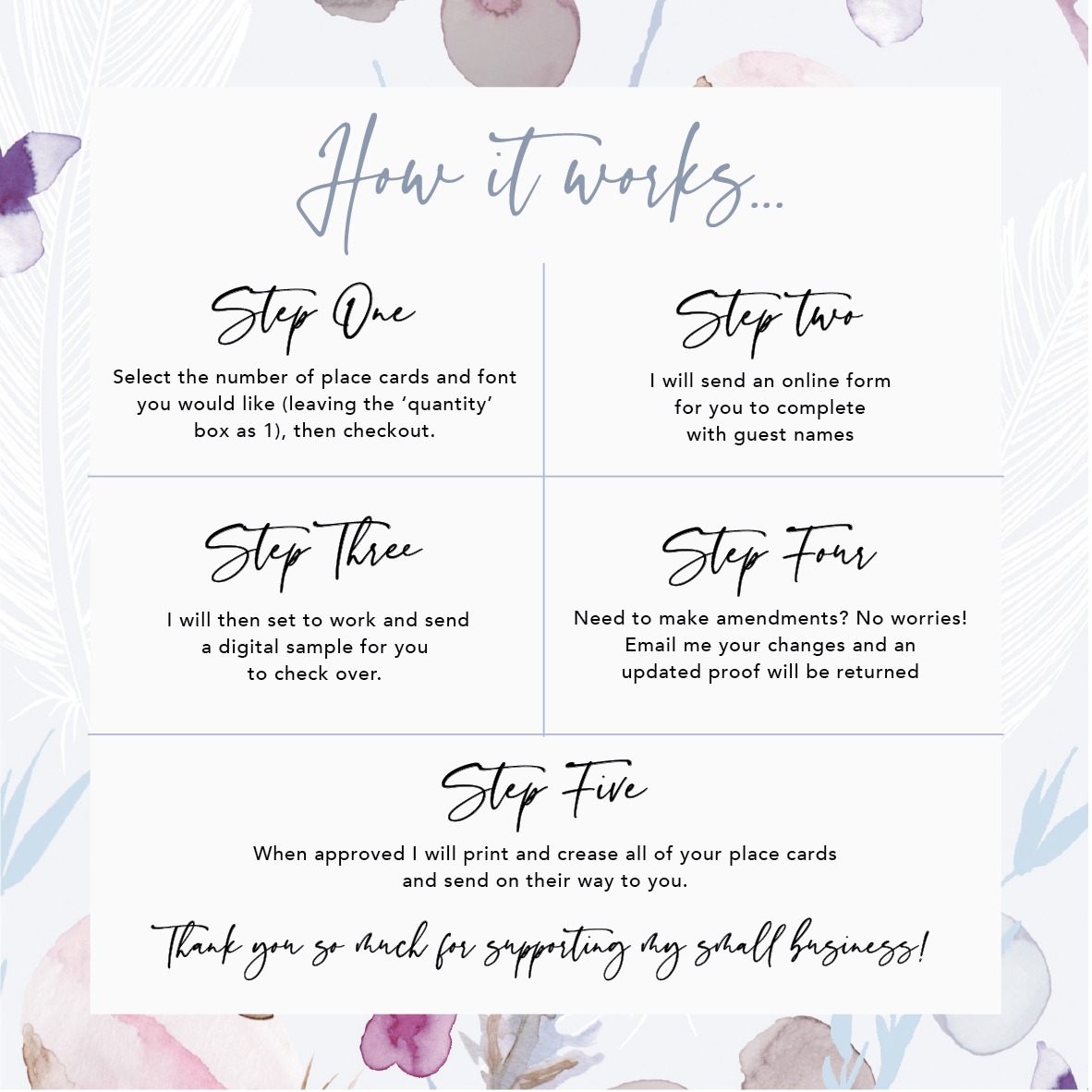 Each place card measures 45x90mm, is printed onto beautiful felt textured 300gsm card stock and elegant vellum and is finished with a rustic twine bow.
