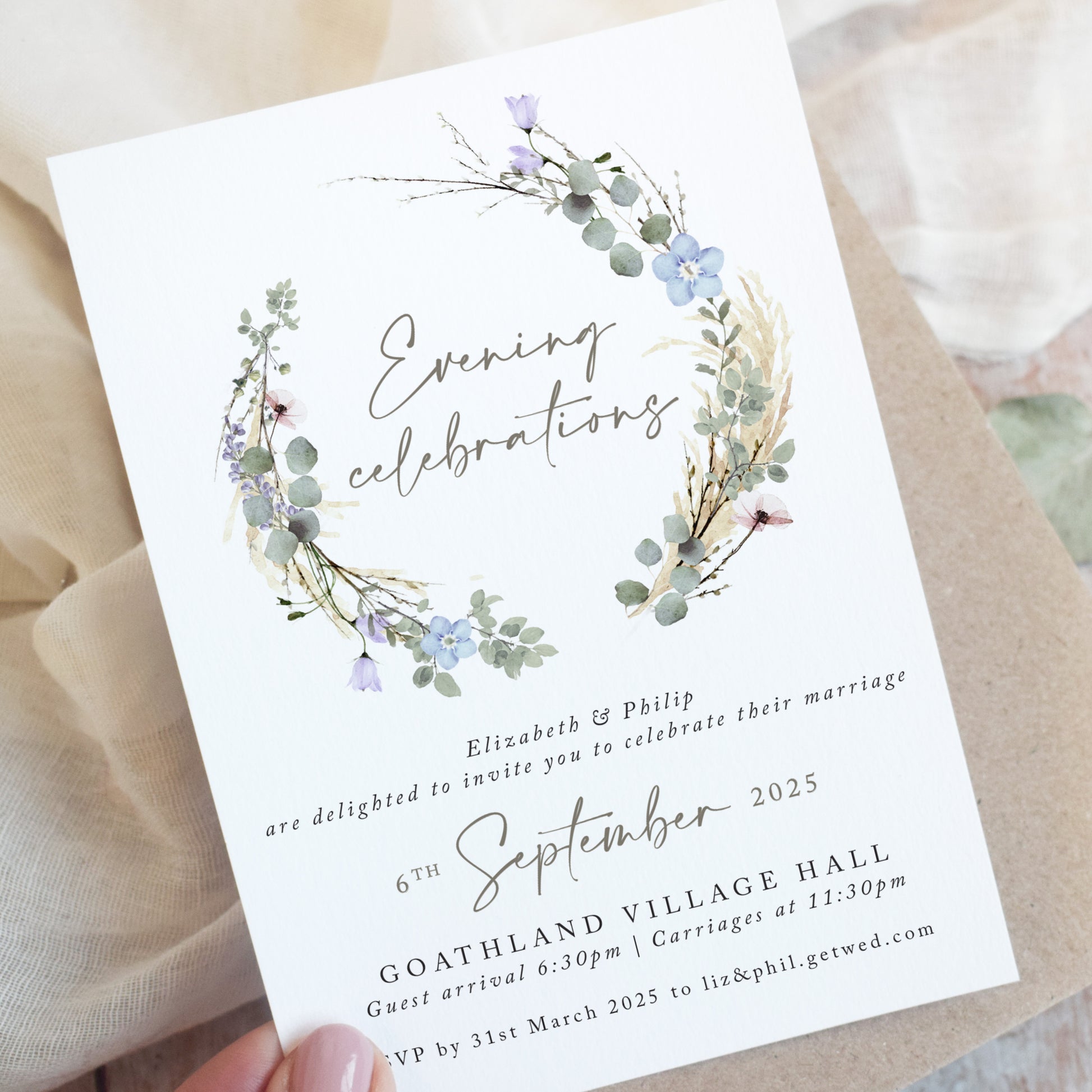 The Periwinkle collection features original illustration work of a sage green leaves with wildflowers,  perfect for setting the scene for a rustic wedding.