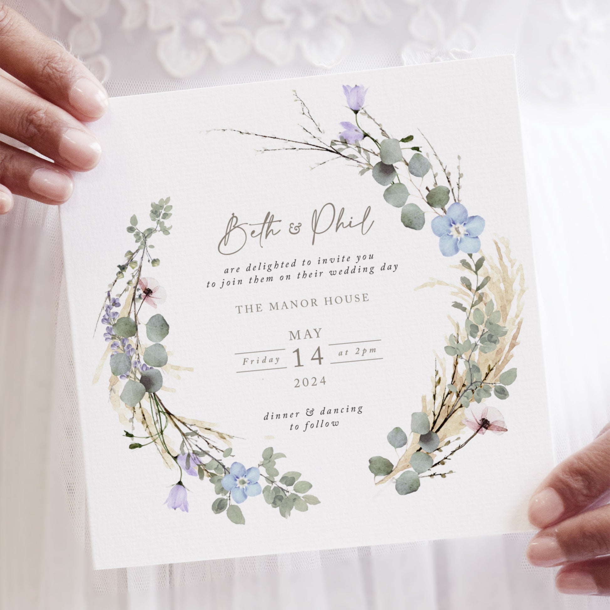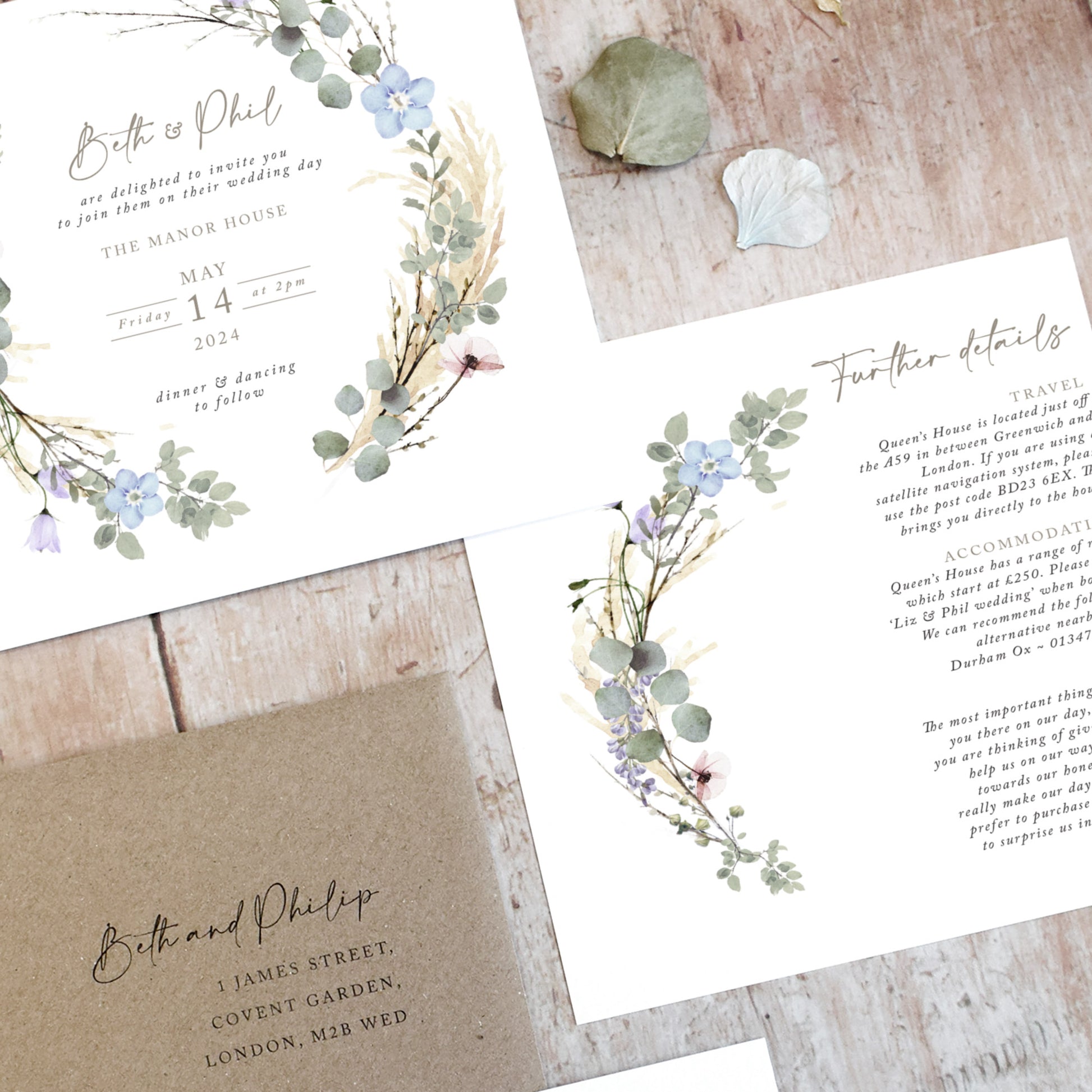 Pretty wedding invitations, featuring a delicate sage green foliage and eucalyptus wreath  with wildflowers and pampas grass, perfect for setting the scene for a rustic wedding.