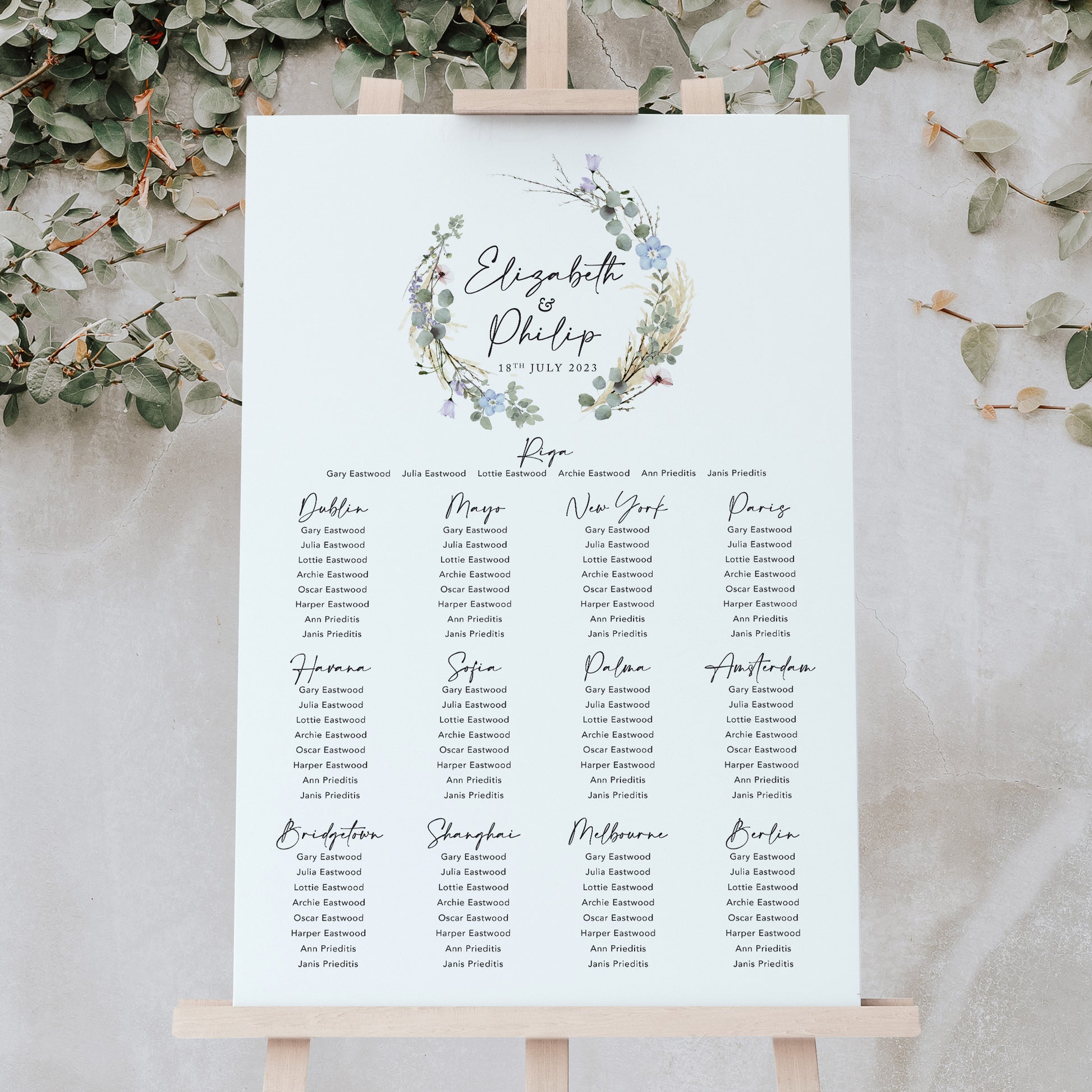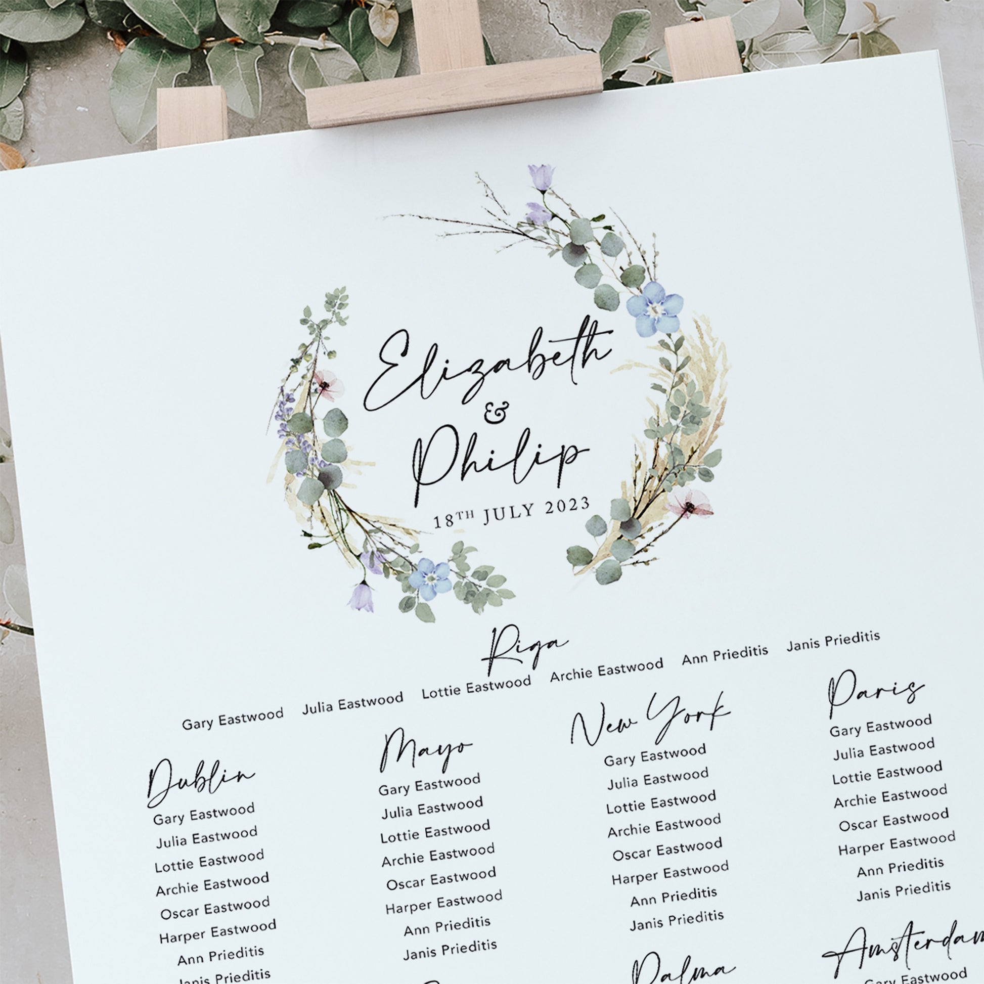 A beautiful premium quality wedding Table Plan board featuring sage green foliage, rustic flowers and set with modern caligraphy type. Fully personalised with your names, date of wedding, table names and guest names. Our table plans are printed as FIne Art Giclee prints and steam mounted onto sturdy mount board; a luxurious high quality finish.