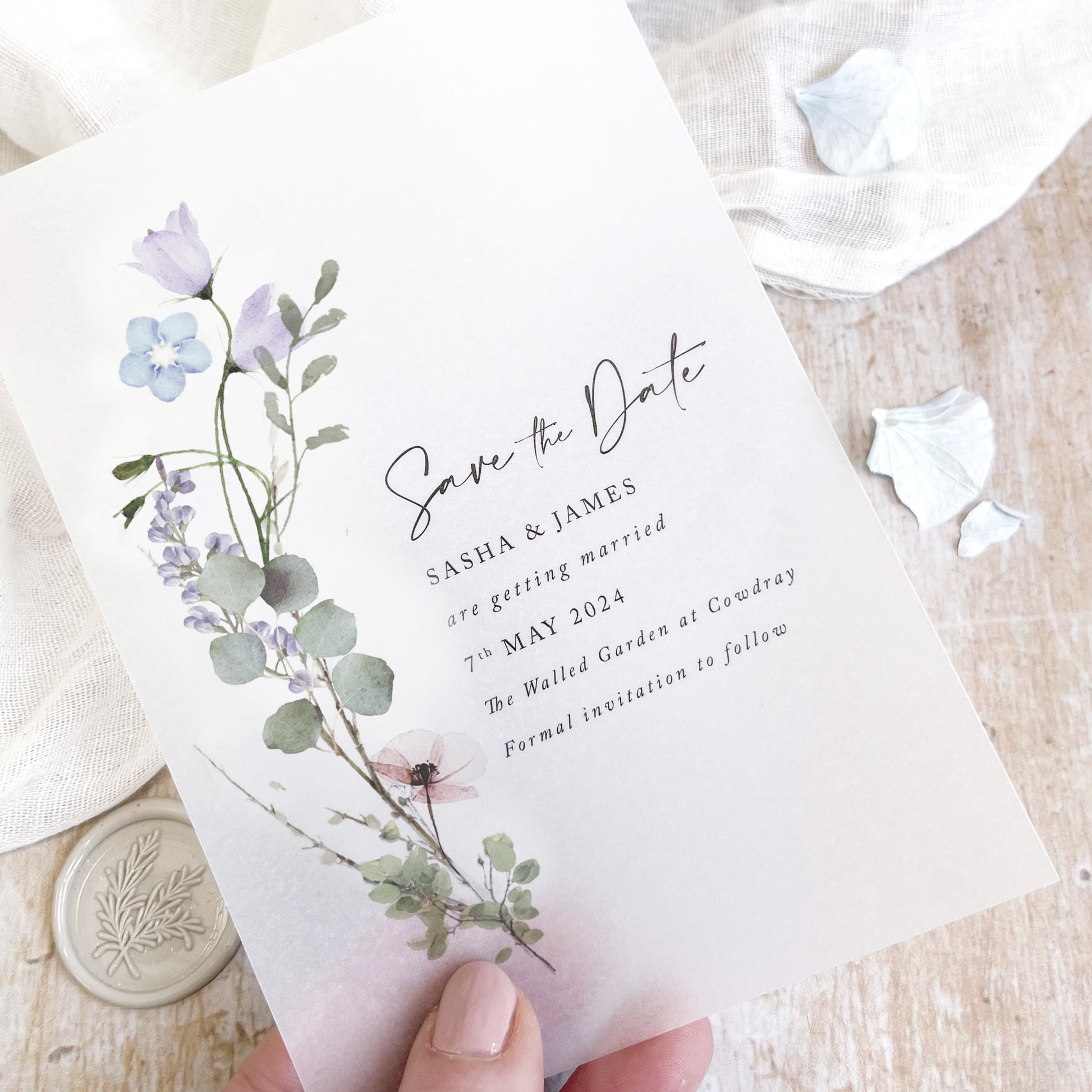 Such an elegant choice for couples planning an modern wedding day featuring original illustrations of sage green foliage with contemporary tyypography. All of our Save the Date cards come with envelopes included and are printed onto luxury 300gsm card stock.