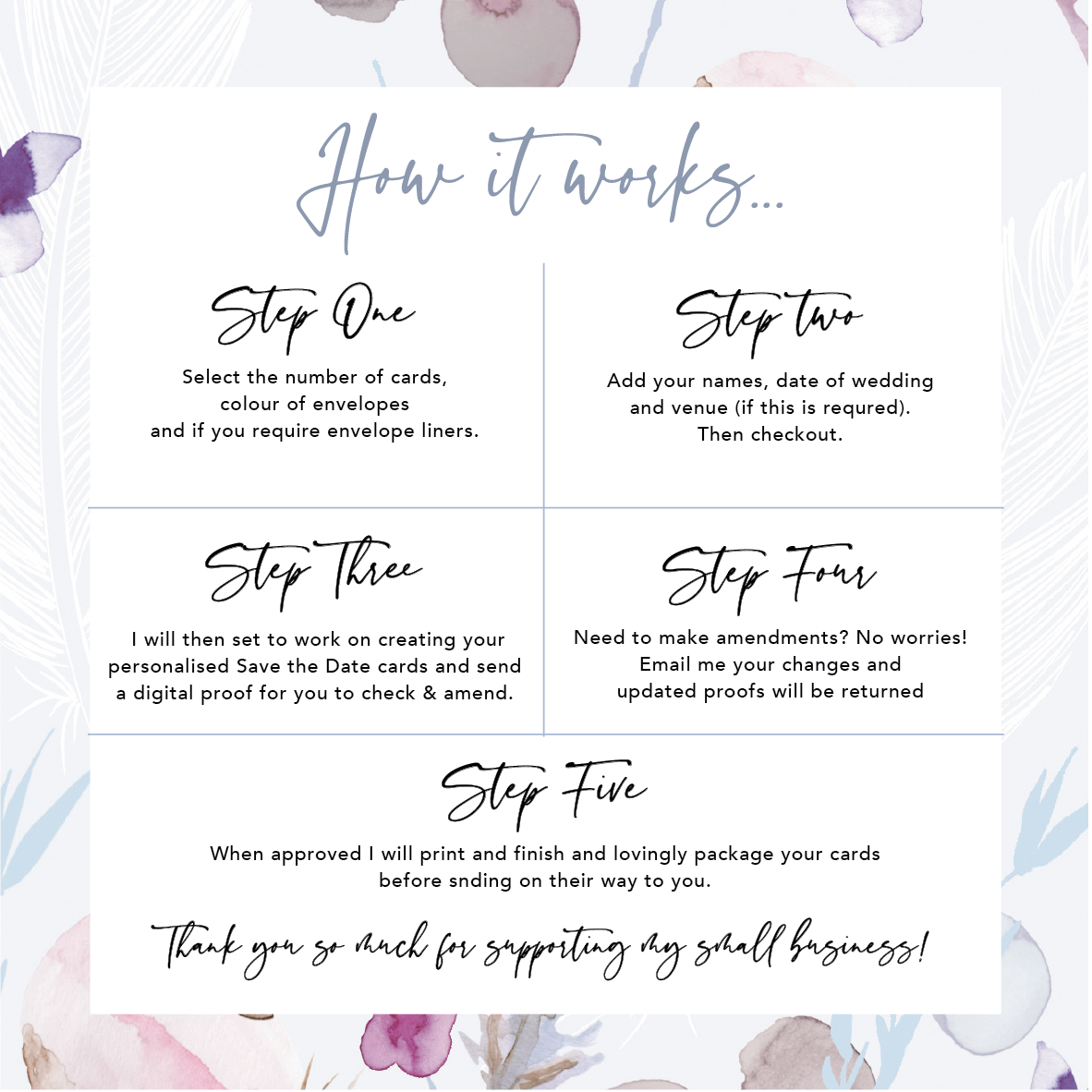 When you place your order simply enter your details in the personalisation fields then sit back and let us do the hard work for you - there are no fiddly DIY templates to navigate - your Save the Date cards will be professionally type set in our Yorkshire wedding stationery studio.