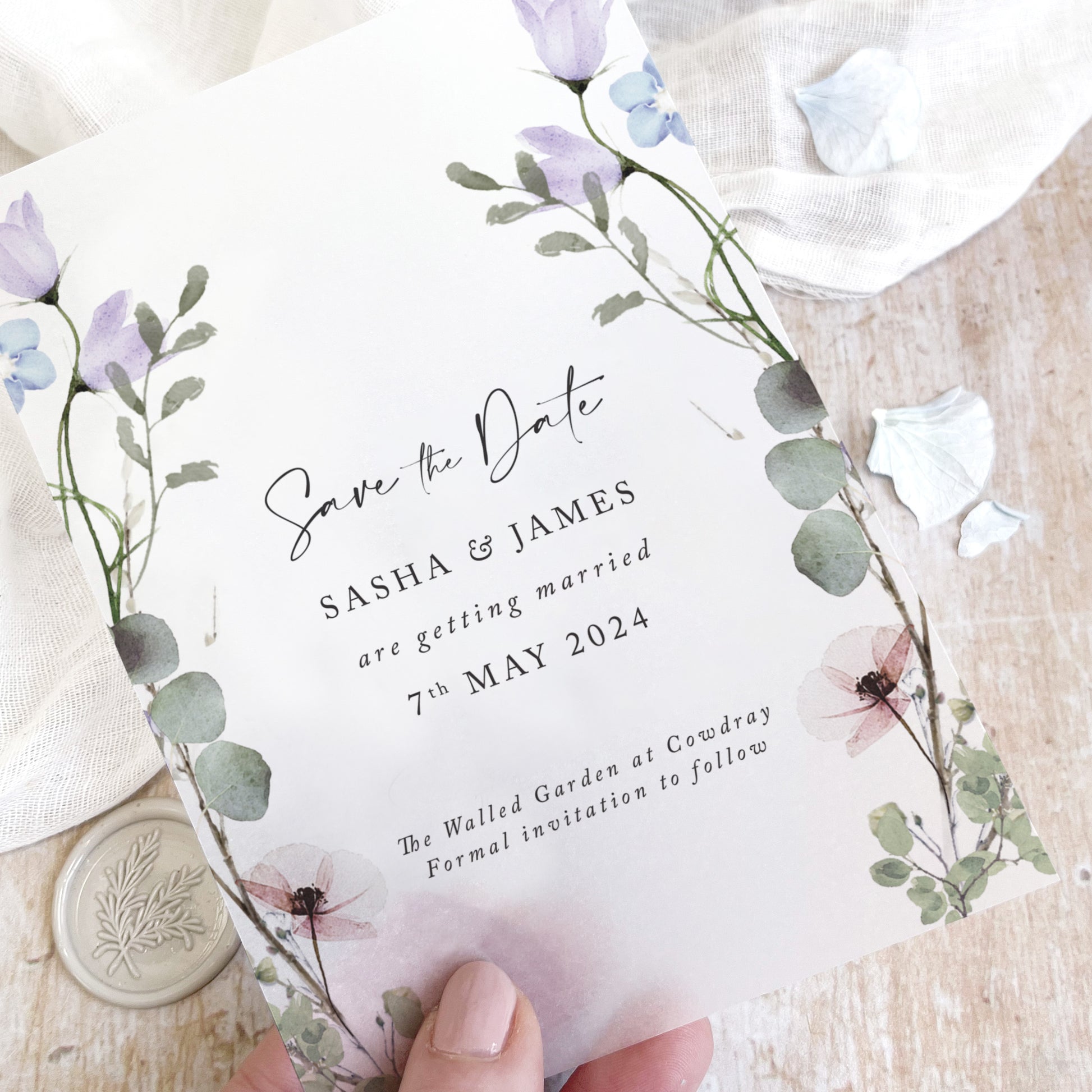 Vellum Periwinkle Floral Wedding Save the Date Cards