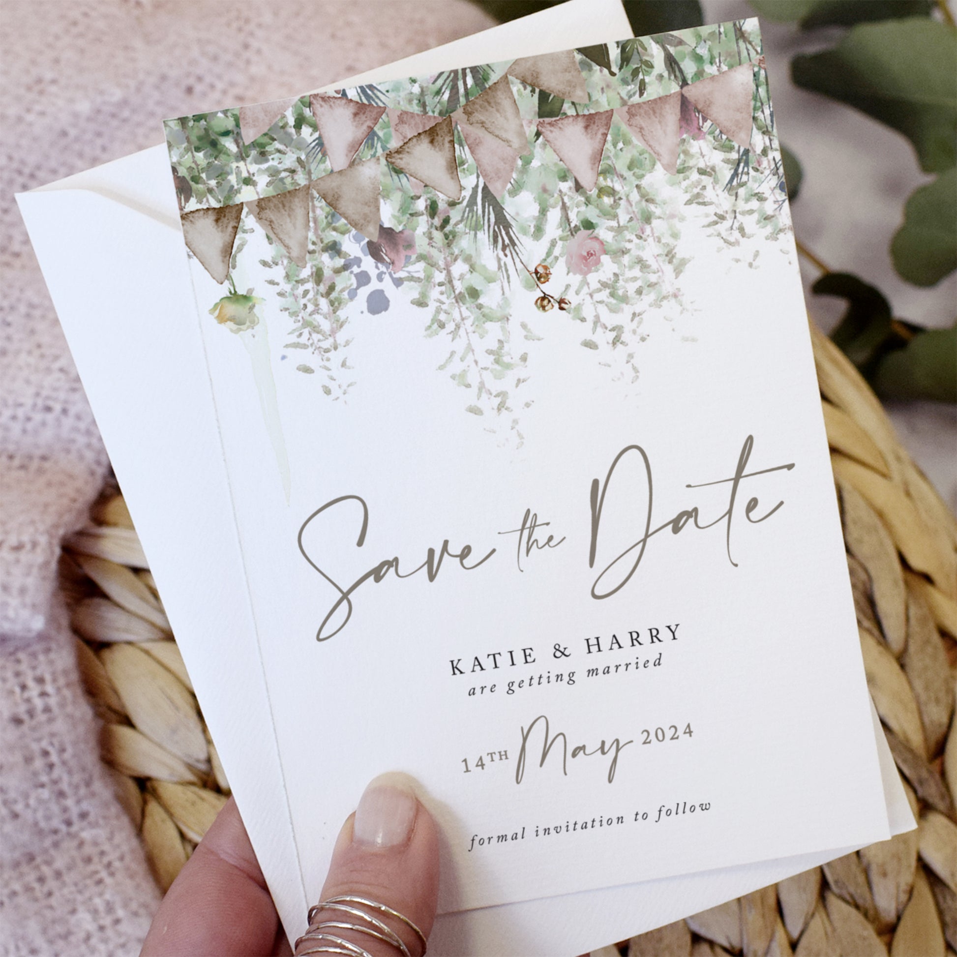 Such an elegant choice for couples planning a rustic wedding day featuring original illustrations of green foliage, dusky pink flowers and rustic bunting. All of our Save the Date cards come with envelopes included and are printed onto luxury 300gsm card stock.