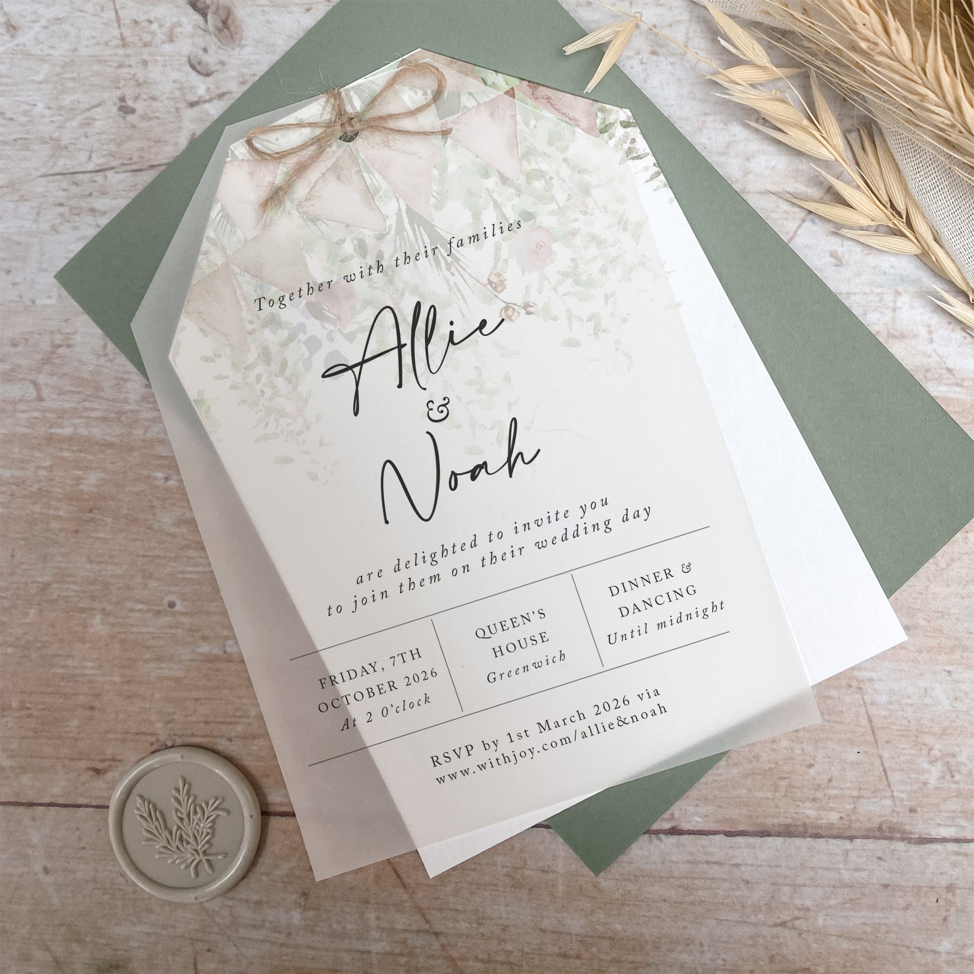 A rustic yet elegant wedding invitation. Finished in a tag shape, featuring a modern vellum overlay on top of an illustrated card and finished with a rustic twine bow. The perfect option for couples who have set up a wedding website but would still like to send guests something a little bit special, without breaking the bank.