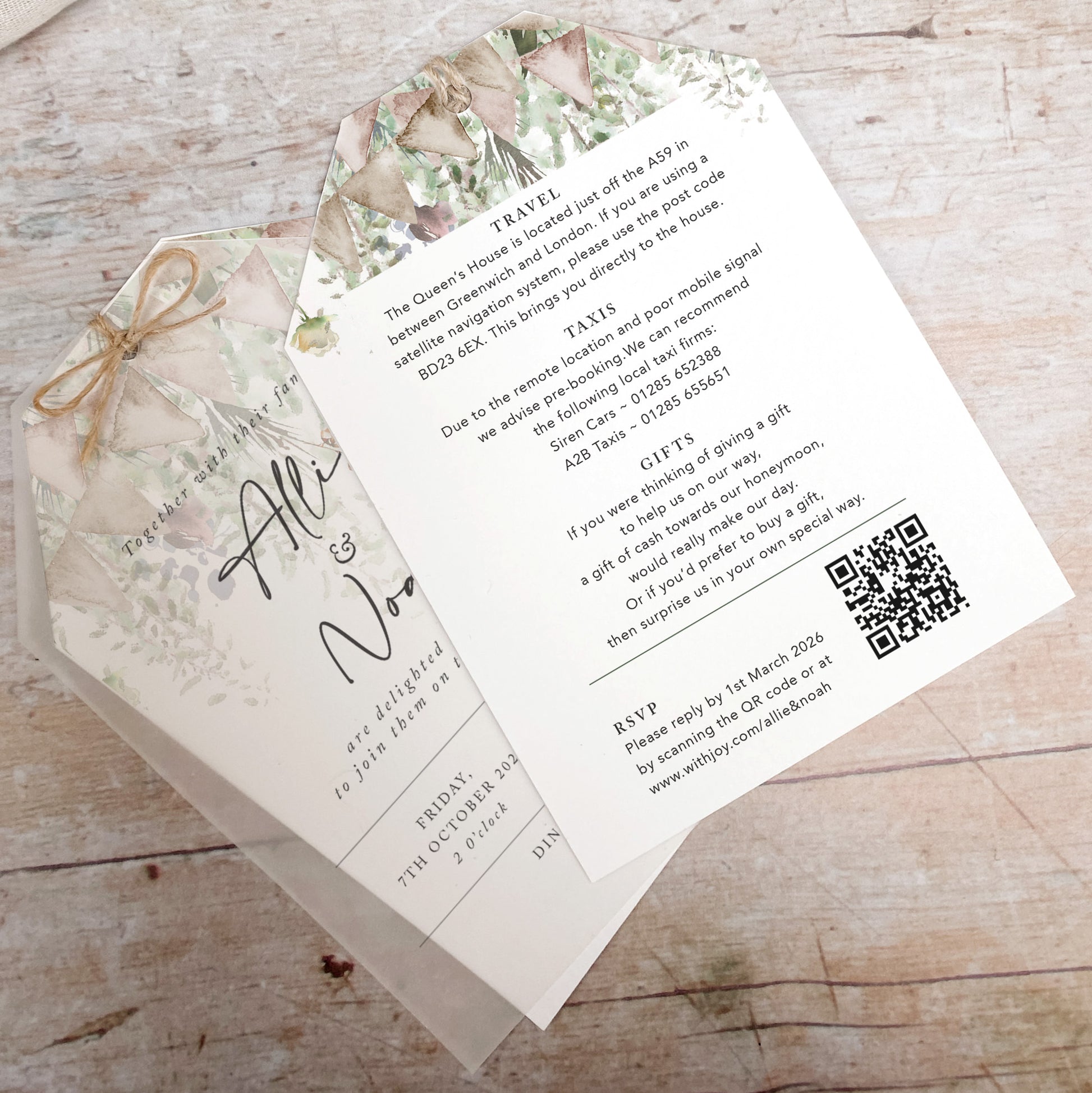 Depending how much information you need to send to guests, information (and a QR code if required) can be printed onto the reverse of the card.