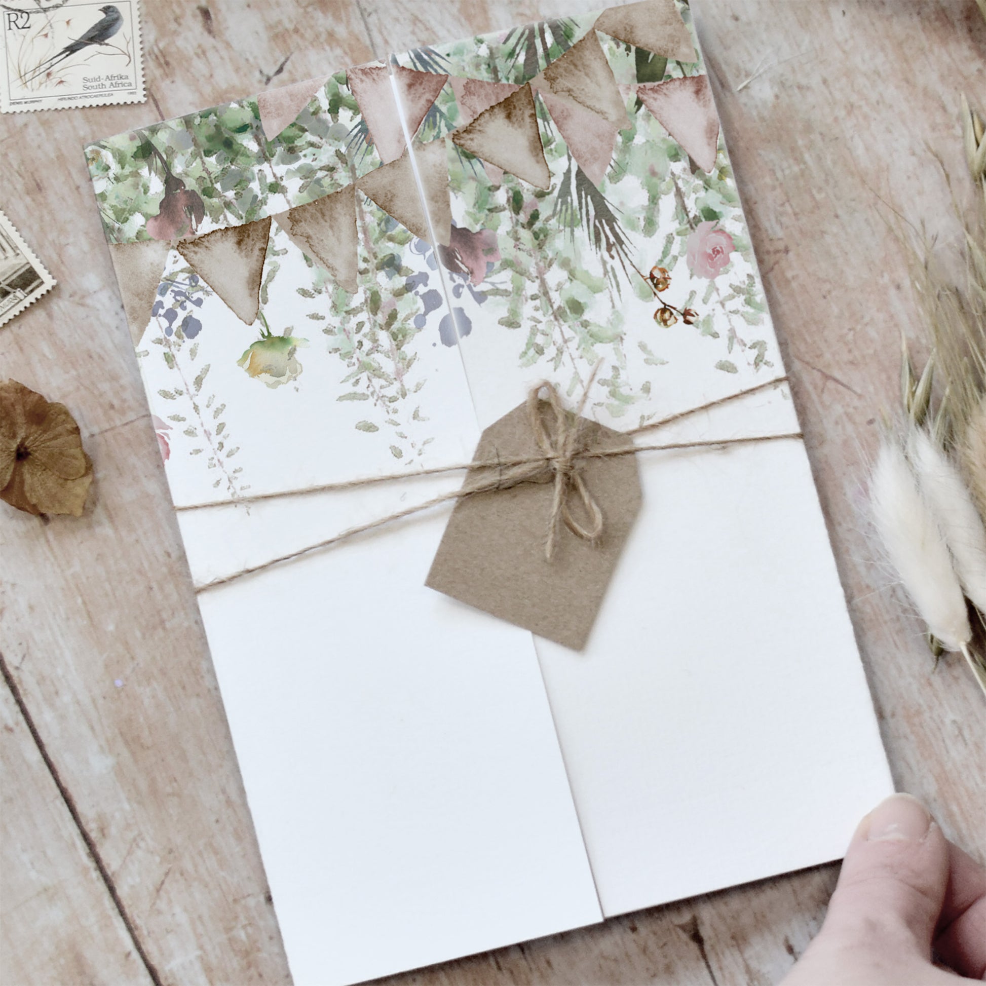 Such a pretty choice for couples planning a rustic wedding day featuring sage green foliage, dusky pink flowers, bunting and modern typography. This wedding invitation comes in a gatefold design and is printed and handcrafted in our Yorkshire studio.