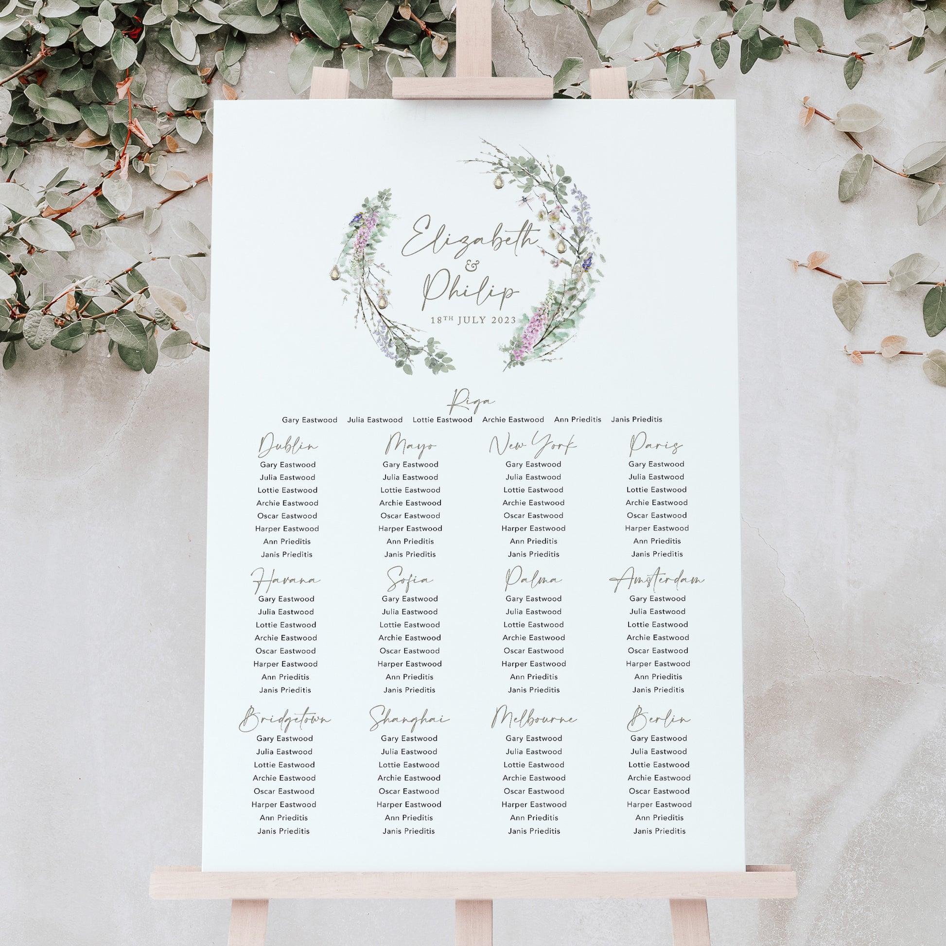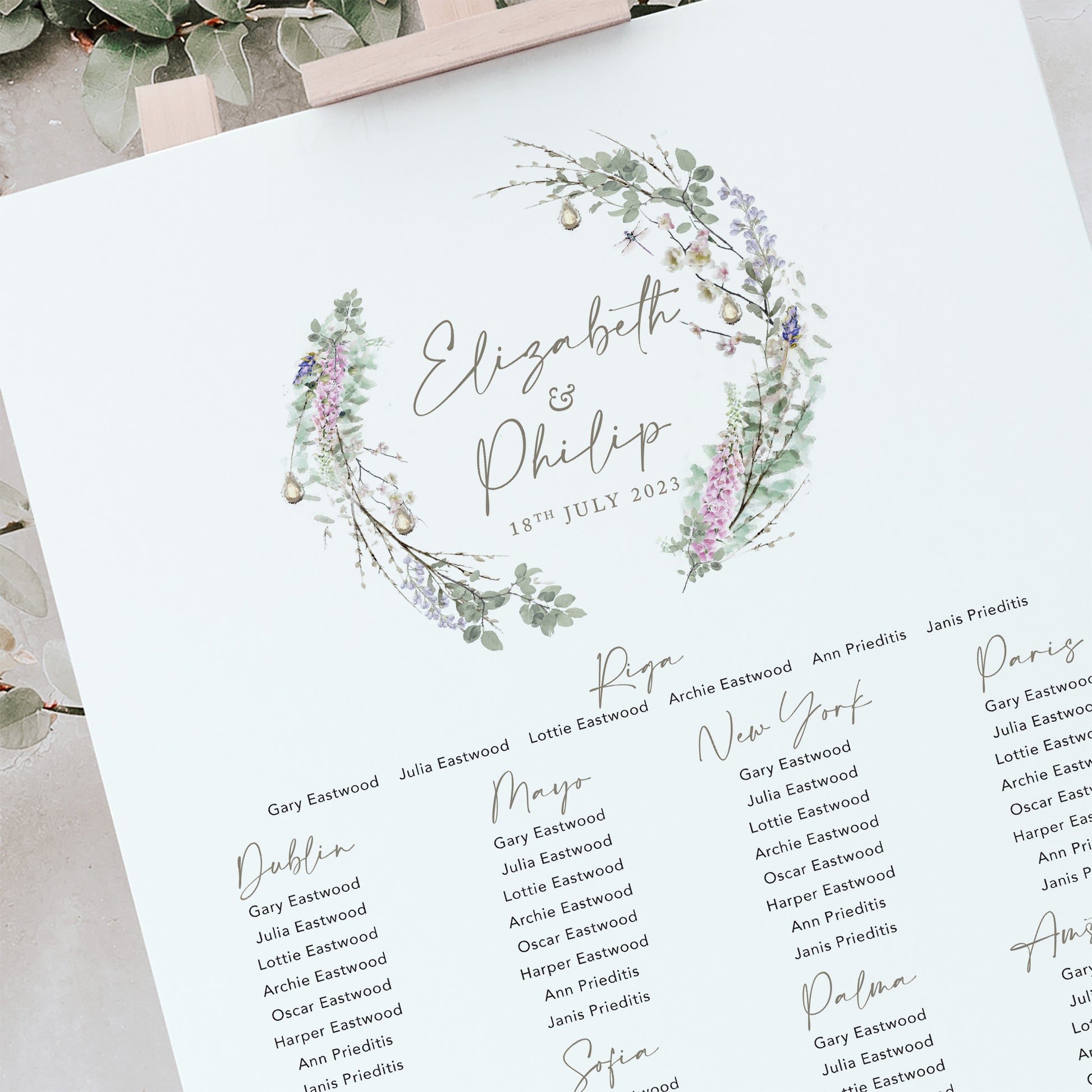 A beautiful premium quality wedding Table Plan board featuring green foliage wreath with pink wildflowers and string lights, and set with modern caligraphy type. Fully personalised with your names, date of wedding, table names and guest names. Our table plans are printed as FIne Art Giclee prints and steam mounted onto sturdy mount board; a luxurious high quality finish.