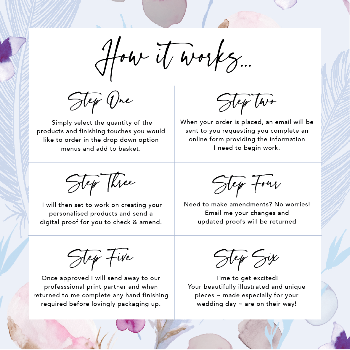 • When you place your order you will be sent a link to an online form to complete with the wording you would like to be featured. Once submitted, sit back and let us do the hard work for you - there are no fiddly DIY templates to navigate - your wedding invitations will be professionally type set in our Yorkshire wedding stationery studio. We'll then send digital proofs for you to check over and only print when you have given your approval.