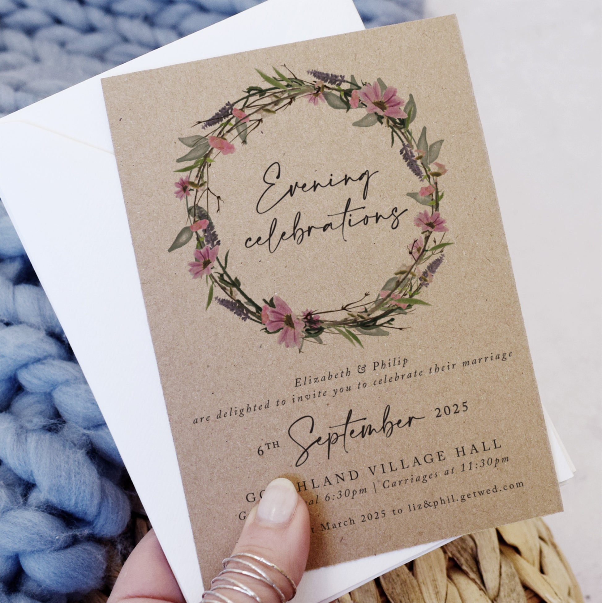 Whisper Wreath Kraft Evening Wedding Invitations