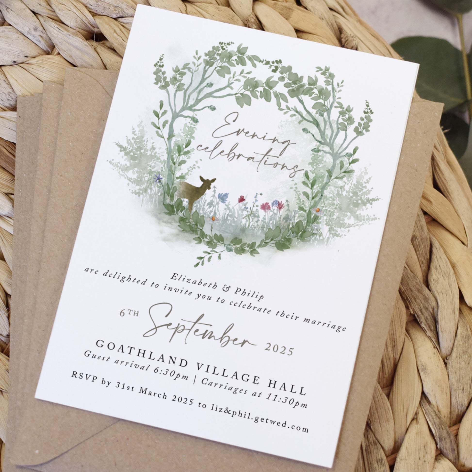 The 'Wildflower' collection features original illustration work of a green woodland scene and wildflowers in dusky blue and pink, perfect for setting the scene for a rustic wedding.