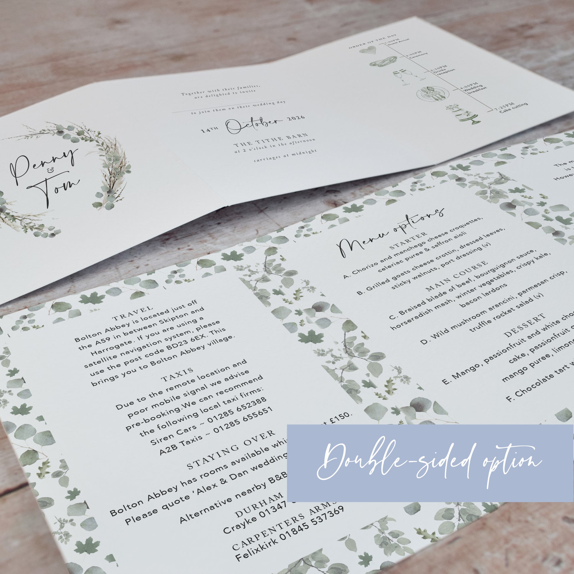 Rustic wedding invitations in a concertina fold format. The wedding invitations feature a watercolour illustration of green foliage set in a delicate wreath. Perfect to set the scene for a classic and elegant wedding or a rustic wedding.