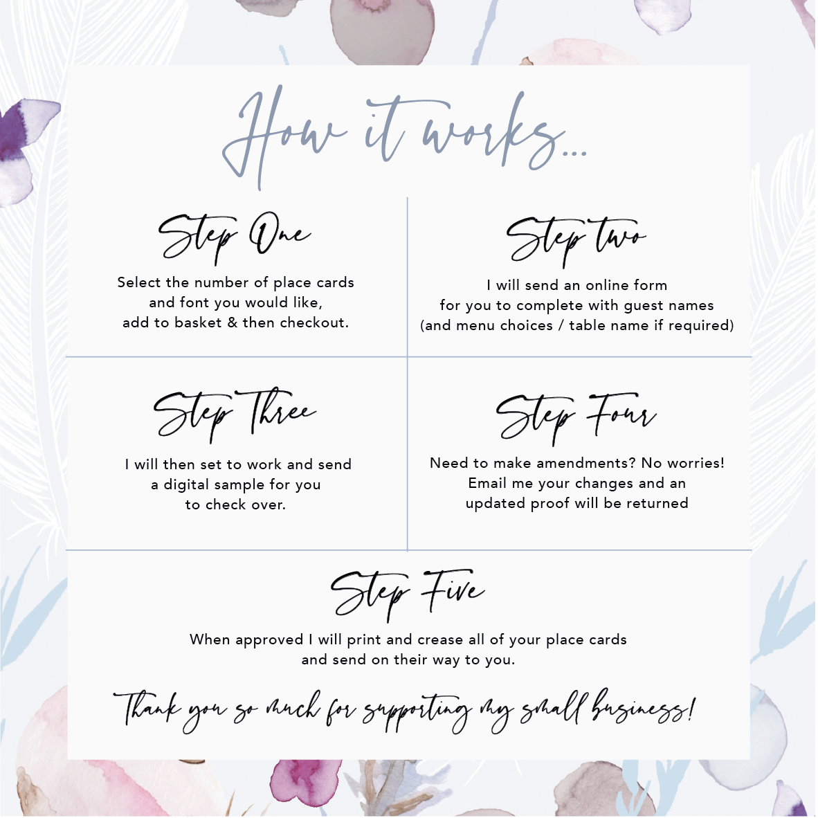 The place name cards are printed with guests names to the front, with the option to add menu choices or table name on the back at no additional cost.